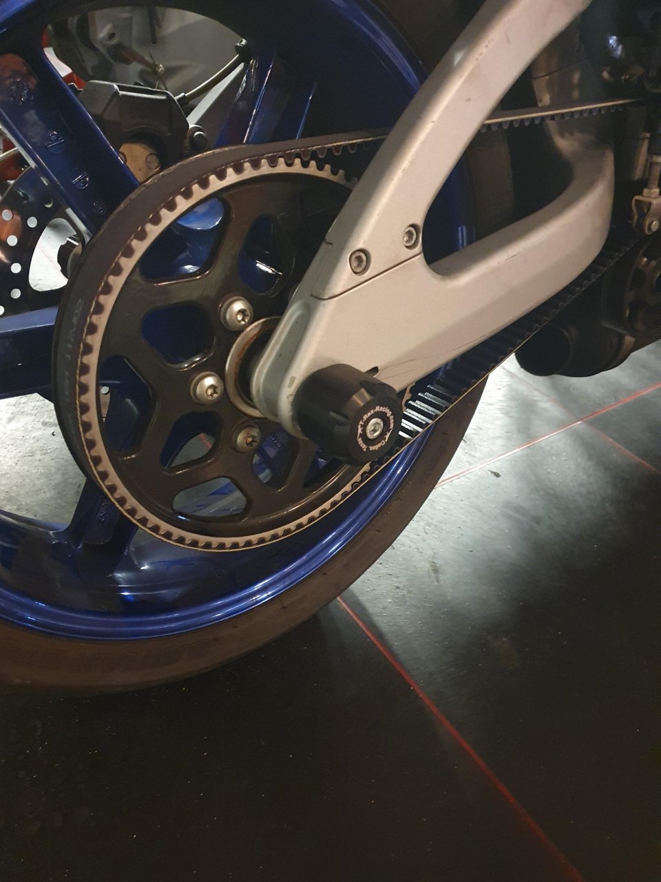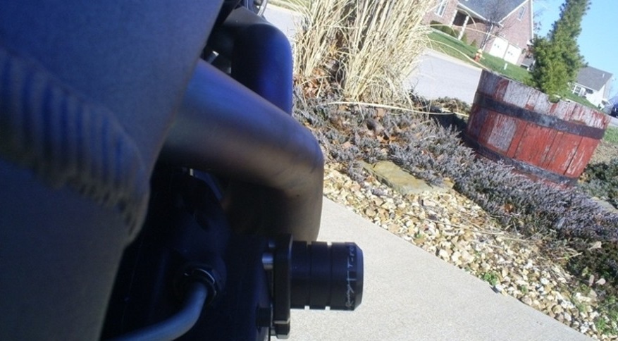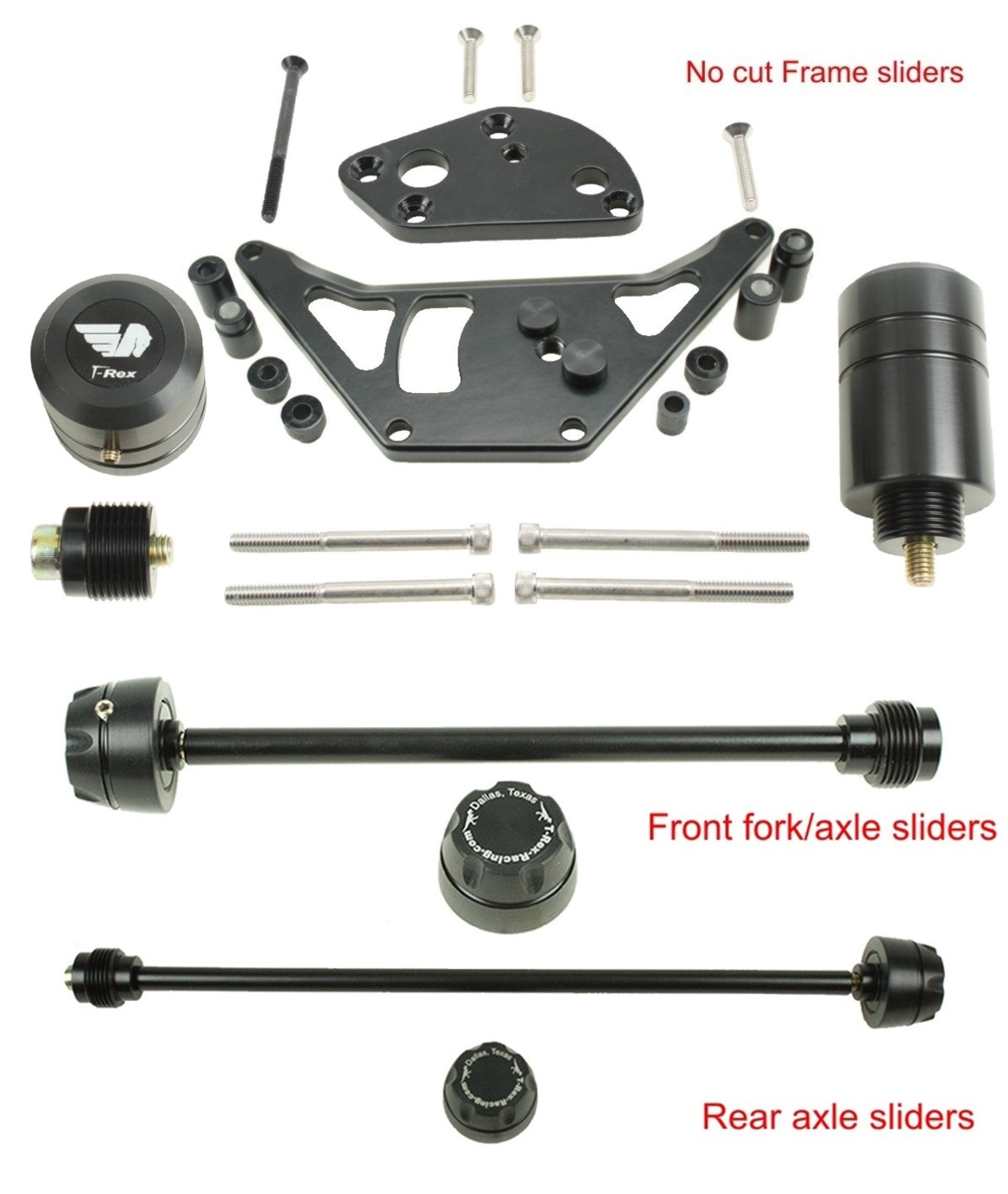 rear axle sliders, front axle sliders and frame sliders. The sliders feature a new design of a complete solid puck without a hollowed-out center. This increases the strength and contact surface to about 30%. The bracket is bolted to the engine mount and the slider puck is bolted onto it. The brackets have four attachment points preventing them from rotating in the event of a low side. The material of the puck is made of UHMW-PE (ultra high molecular weight polyethylene), a tough plastic with good strength, wear resistance and dimensional stability. It is more dimensionally stable than Nylon and used in many industrial ball bearing and friction reducing applications. Compared to Delrin, it is softer but tougher. Delrin is harder but more brittle. It is an ideal material for frame sliders since it can absorb more impact force onto itself and therefore reduce the impact on the frame and engine. The slider pucks can be inexpensively replaced in case of a low-side. The rear axle sliders provide indispensable protection for your beautiful expensive swing-arm. For the front and rear axle sliders the installation is a simple bolt on with the bar going through the axle and one plastic puck on each side. The long bar and inserts inside the sliders are made 6061-T6 aluminum for strength. We use highest grade commercially available 12.9(177,000 psi in tensile strength) wherever possible. Rest assured that you are getting the best material commercially available.