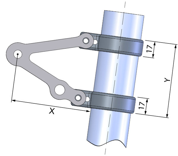 X = 97mm ( center head light mountin hole to the front off the legs )  Y = 74mm clamp to clamp