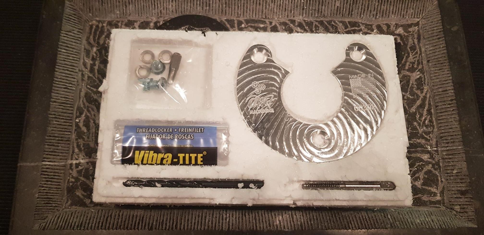 The kit comes with instuctions, plate, screw bit, screws, washers,  loctite, dril and tap.