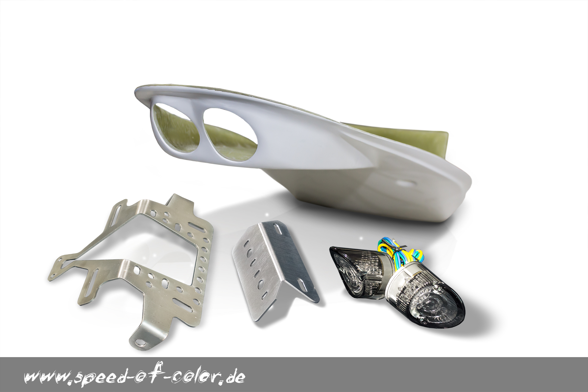 This complete rear undercarriage is made of high-quality Fiberglass material and is supplied with two LED taillights including Stainless steel license plate holder and lighting!