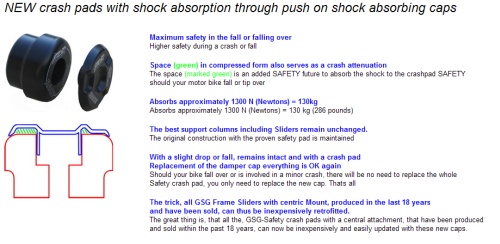 Buell X1,S1,S2,S3,M2 crash protection kit Black Engine Crash protection for all Buell tube frame models with Black right side base plate Maximum safety in the fall or falling over With a slight drop or fall, remains intact and with a crash pad Replacement of the damper cap everything is OK again Should your bike fall over or is involved in a minor crash, there will be no need to replace the whole Safety crash pad, you only need to replace the new cap. Thats all The trick, all GSG Frame Sliders with centric Mount, produced in the last 18 years and have been sold, can thus be inexpensively retrofitted. The great thing is, that all the, GSG-Safety crash pads with a central attachment, that have been produced and sold within the past 18 years, can now be inexpensively and easily updated with these new caps.