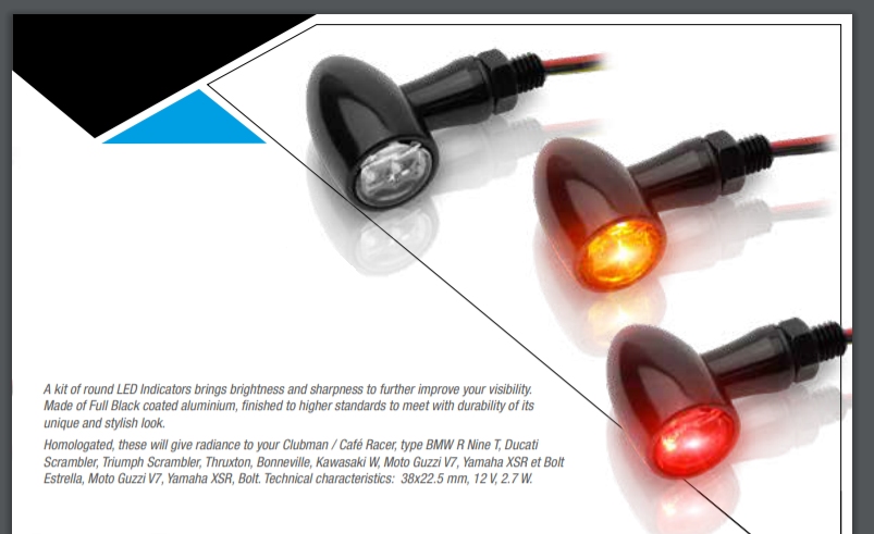 A kit of round LED Indicators brings brightness and sharpness to further improve your visibility. Made of Full Black coated aluminium, finished to higher standards to meet with durability of its unique and stylish look. Homologated