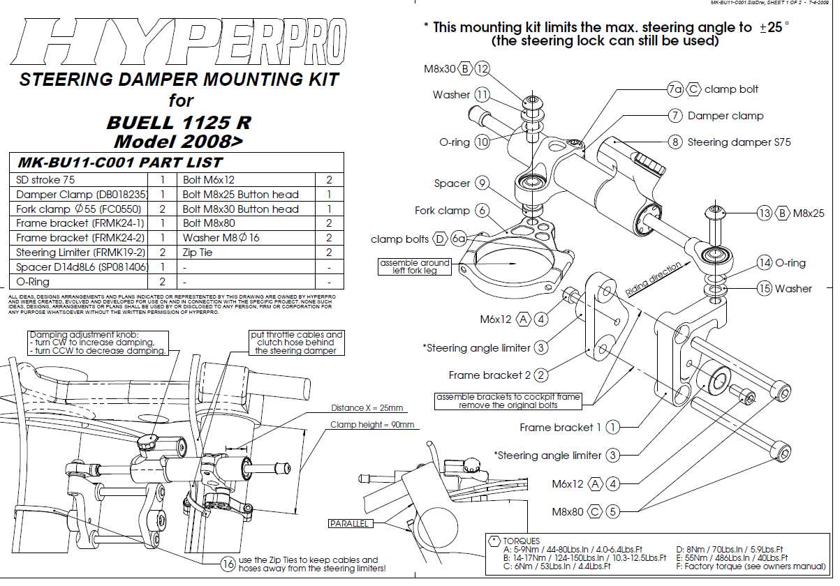 | MK-BU11-C001 | Buell 1125 R Hyperpro mounting kit steeringdamper | 1x | | DS-075B-NP1 | progressive steering damper BLACK stroke 75 | 1x |