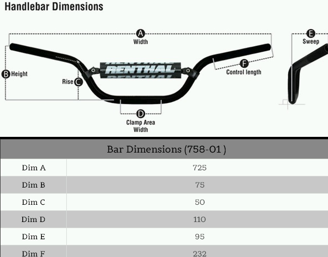 Renthal Road bike ultra low handle Bar Black The following features are integral to the Renthal 7/8' handlebars. 7/8' (22mm) external diameter to fit most standard sized clamps and controls 7010 T6 Aluminium, which Renthal has exclusive rights to this specially developed alloy, for the manufacture of handlebars. High impact strength, lightweight and excellent vibration dampening Shot peened surface finish to help prevent fatigue failure Knurling Grip end only increases bonding between bar and grip No knurling in clamp area, this could cause a stress riser and lead to fatigue failure Anodising a 15 step anodising process forms an integral coating giving protection against corrosion Renthal copyrighted, bonded lightweight single bolt clamping system for the cross-brace* , greatly increases strength whilst still allowing flex Laser etched positioning grid The highest quality individual steps/processes required in the production of each bar and 58 separate quality checks made