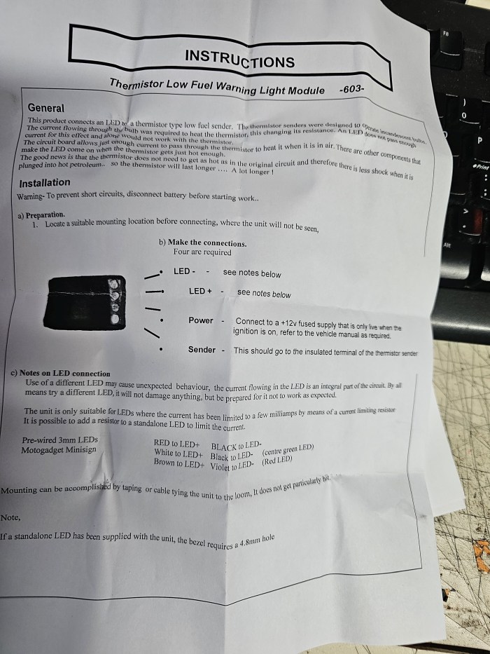 • it needs to be connected to a 1K thermistor type low fuel sender (the thermistors are universal, for a specific example see the   R6 Yamaha)