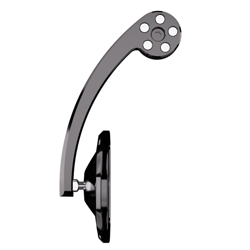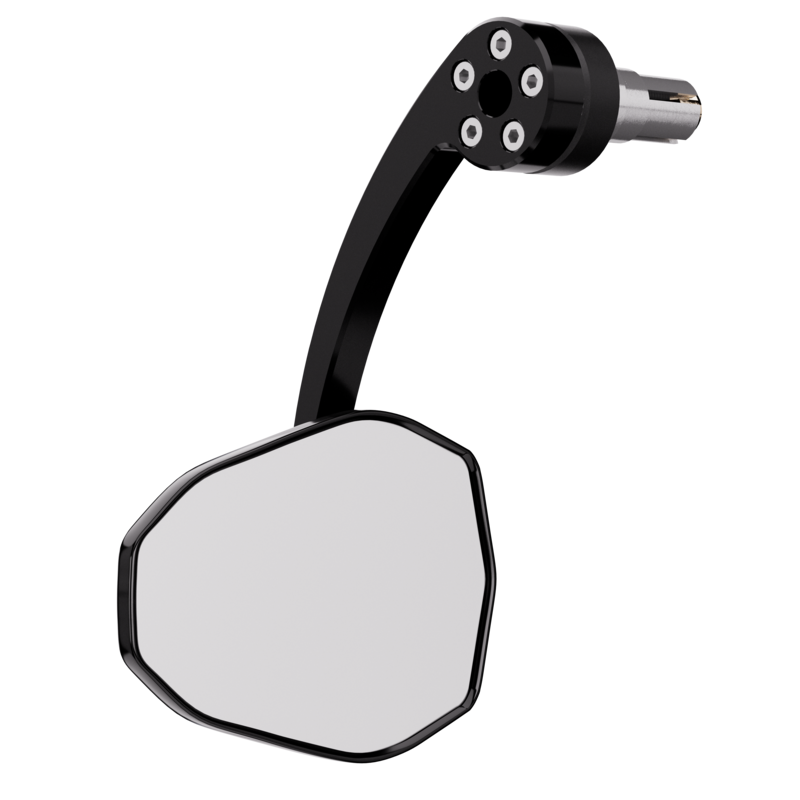 Elegant handlebar end mirror with a black anodized head made of aluminum and a curved stem – without kink like the model HIGHSIDER pro VICTORY. Suitable for handlebars with an inner diameter of 12 to 22 mm, i.e. for most 7/8 inch and 1 inch aluminium or steel handlebars. Can be used for left and right side, E-approved.