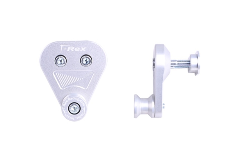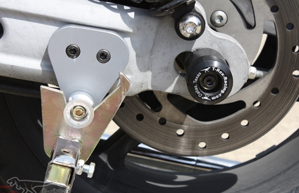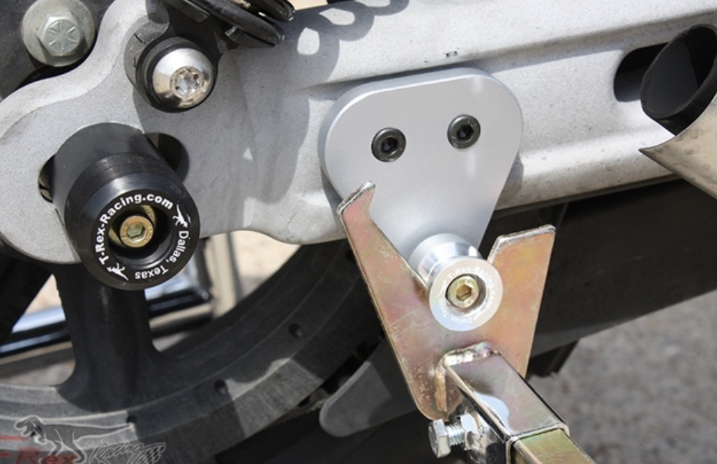 This purchase is for a set of spool adapters for the above models. Lifting the rear of a bike is uniquely challenging. The swing-arms have no threaded holes for spools and are at an angle. Without spools the bike can be difficult to lift with a stand. Once lifted, it can be unstable. The angle on the swing-arms makes it worse. It can cause the bike to slip off the stand and fall. T-Rex spool adapters are made to meet this challenge. They are designed to securely attach to the swing-arms and allow safely lifting of the rear wheel using a paddock stand. You will be able to remove your rear wheel or lube your chain as well, no other manufacturer allows this. They also serve as swingarm sliders, which can take some of the impact away from the swingarm in the event of a fall or tip over. The brackets and spools are made out of aircraft grade silver anodized aluminum. The adapters come in silver only.
