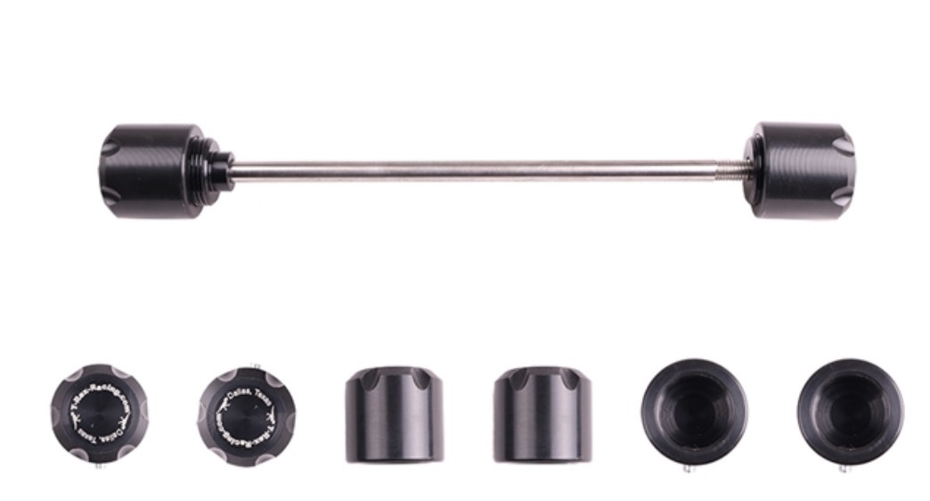 This purchase is for a pair of front axle sliders that help protect your bikes front fork in case of a low-side. It allows the fork to slide on the plastic puck instead of the fork itself. The installation is a simple bolt on with the bar going through the axle and one plastic puck on each side. The sliders are made of UHMW-PE (ultra high molecular weight polyethylene), a tough plastic with good strength, wear resistance and dimensional stability. It is more dimensionally stable than Nylon and used in many industrial ball bearing and friction reducing applications. The bolts are made of highest grade commercially available 12.9(177,000 psi in tensile strength). The long bar is made of billet aluminum. Rest assured that you are getting the best material commercially available.