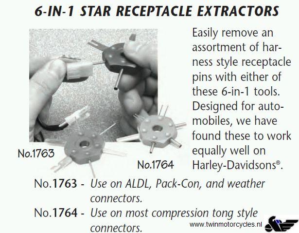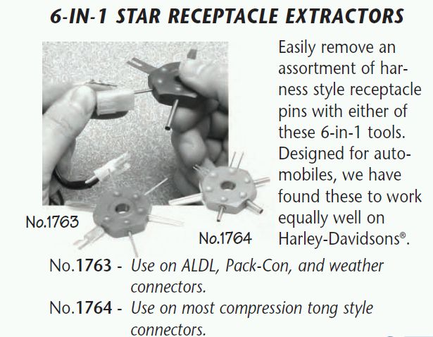 Easily remove an assortment of harnessstyle receptacle pins with either ofthese 6-in-1 tools.