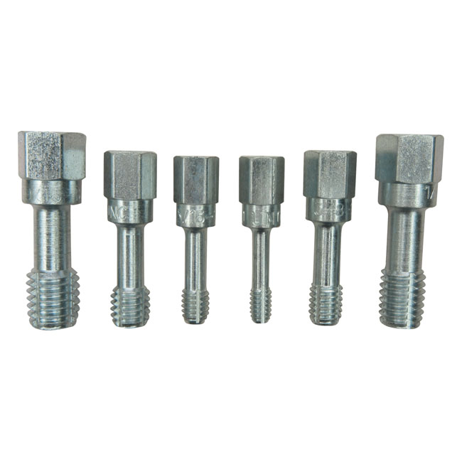 For internalthreads. 6-pc UNC (coarse threads). Incl. 1/4"-20, 5/16"-18, 3/8"-16, 7/16"-14, 1/2"-13, 9/16"-12. Used to restore damaged internalthreads. This are special threaded restoring dies that ensure a good result and they are safer in restoring threads ... | |