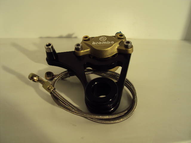Kit includes a 2 piston rear Brembo caliper ( black version ) , and a CNC machined aluminium billet caliper plate, caliper bolts, banjo bolt and Goodridge stainless steel braided brake hose.
