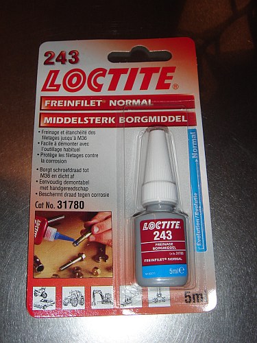 | | | Loctite 243 ( blue ) 5cc | €16,95 Add to cart | | Loctite 243 Threadlocker is a general purpose, medium strength threadlocker with improved oil tolerance. For fasteners between 1/4' and 3/4' (6 to 20 mm) diameters.