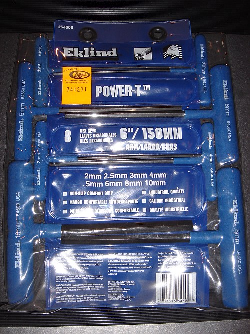 | | | Eklind 8 piece Metric Power-T hex keyset | €51,51 Add to cart | | Eklind 8 piece Metric Power-T hex key set, Eklind Power-T TM Keys feature an ergonomic, textured, slip-resistant grip which provides extra torque and safety. Eklind keys are manufactured from the highest quality hex steel, heat treated for maximum strength and finished to resist rust. Sizes included; 2 / 2,5 / 3 / 4 / 5 / 6... | |