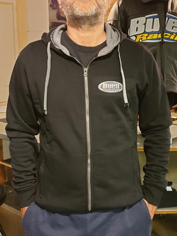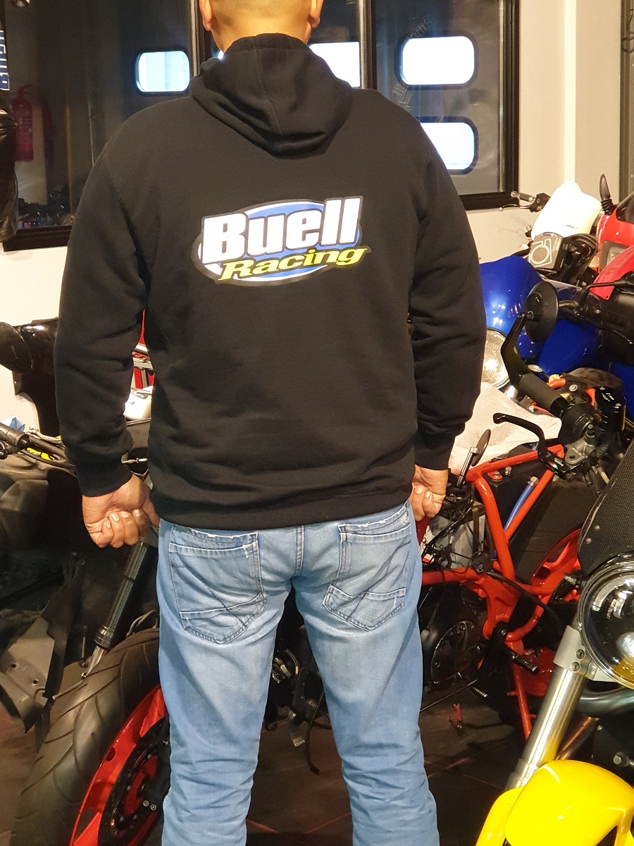 | | | Buell RACING Hoodie LARGE | €54,00 Add to cart | | Buell RACING Hoodiewith small logo on the front and big logo on the back. 1 large zippers in the front and 2 sidepocketzippers.