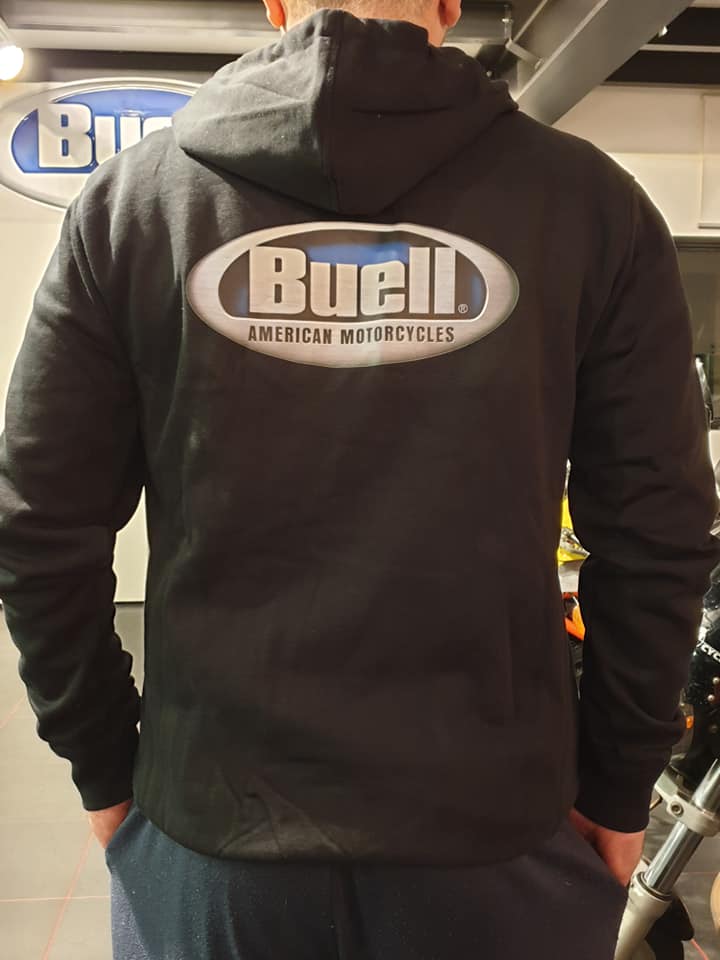 | | | Buell Hoodie LARGE | €54,00 Add to cart | | Buell Hoodiewith small logo on the front and big logo on the back. 1 large zippers in the front and 2 sidepocketzippers.