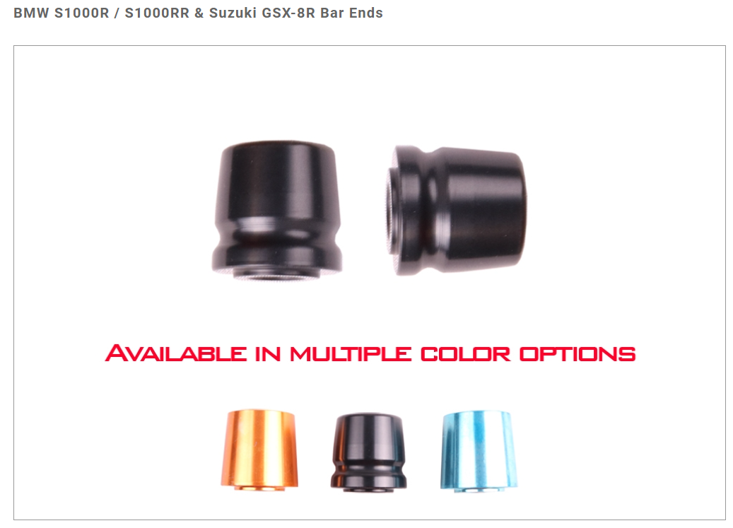 | | | BMW S1000R / S1000RR & Suzuki GSX-8R Bar Ends | €92,00 Add to cart | | BMW S1000R / S1000RR & Suzuki GSX-8R Bar Ends